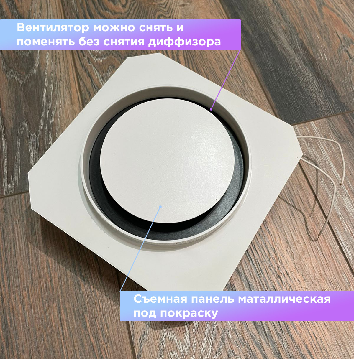 Так же диффузор состоит из металлической заслонкой, которой можно регулировать поток воздуха, либо полностью перекрыть его. К заслонке с помощью магнитов крепится декоративная круглая панелька, которую можно покрасить в цвет потолка. Так же по ободку диффузора имеется молярная сетка, для надёжной фиксации шпаклёвки. Наши диффузоры оснащены москитной сеточкой, которая препятствует попаданию насекомых в помещение.